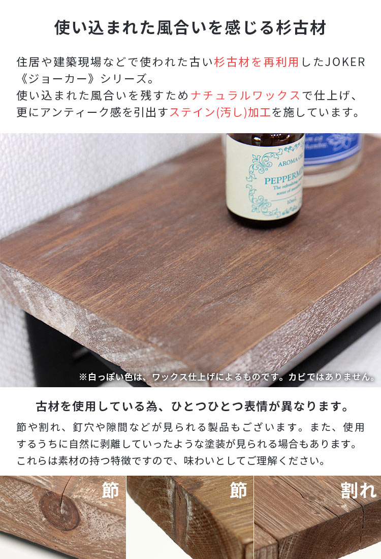 商品サイズ 約幅290×奥行き100×高さ80(mm) 重量 約0.8(kg) 材質 木部:杉古材(ナチュラルワックス仕上げ) 脚:スチール(粉体塗装) 備考 完成品※付属の木ネジで壁に取付け 1つ1つ木材の表情が異なります。